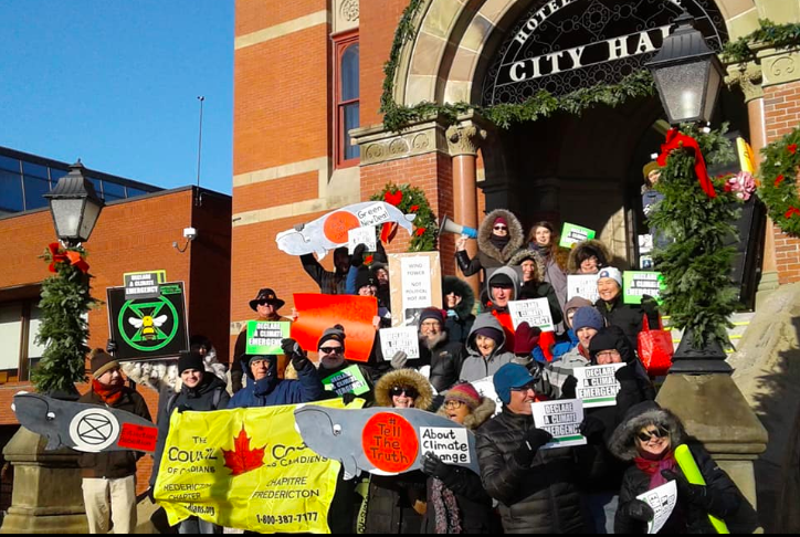 After the rally, Extinction Rebellion (XR) spokespersons Emma Johnson and Sinclair Green invited participants to join a march to Fredericton City Hall to urge the City Council to declare a climate emergency. On the steps of City Hall, Council of Canadians Fredericton Chapter spokesperson Katalin Koller read a declaration demanding action from the City. The previous evening, at a Fredericton climate change adaptation event organized by the City, the group had demanded that Fredericton mayor and city council declare a climate emergency.